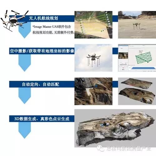 新版Image Master能够完全实现海量影像数据的自动拼接和建模,特别是专为无人机测图设计的ImageMasterUAS版本,更是加入了航线规划和影像质量评估等功能,搭配小型固定翼或旋翼飞机,能够轻松实现从空中影像获取真彩色点云等三维数据。