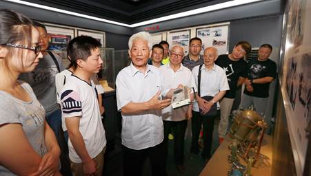 ▲在国测一大队荣誉室为年青队员讲述野外工作生活情况