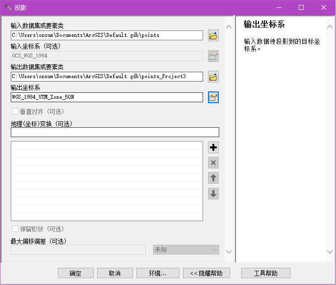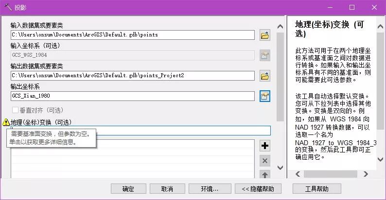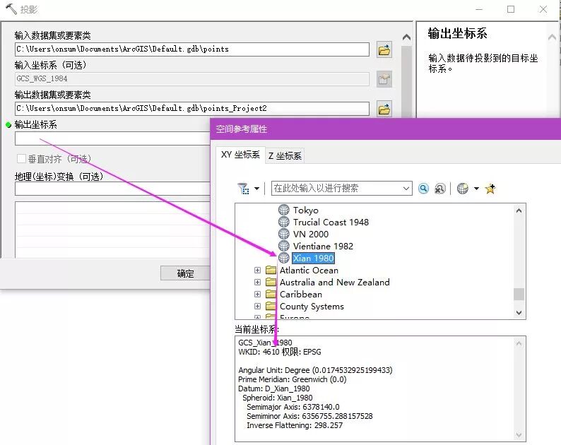 打开如下工具:数据管理工具/投影和变换/投影,设置界面如下(以WGS1984转西安80为例):