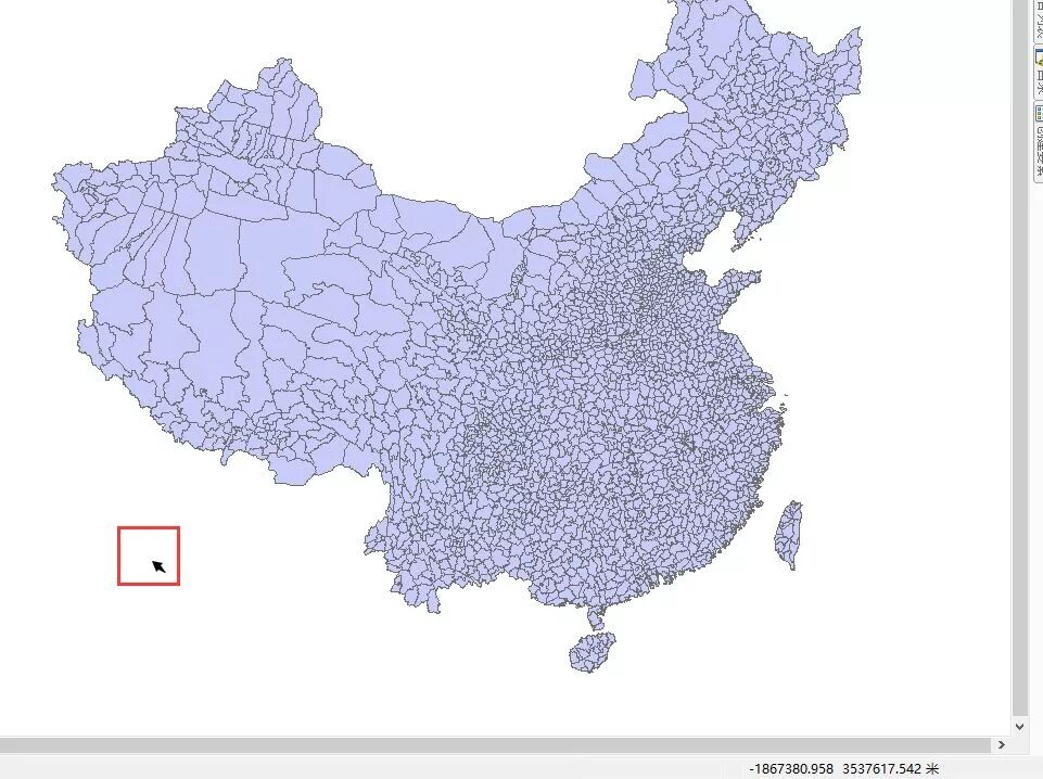 例如,整个中国地图理应跨越好几个投影带,却给了某一个投影带的投影坐标系,这就会出现负值。如下图,红框箭头是鼠标的位置