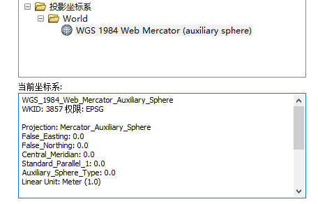 给了WKID:3857,名字是WGS_1984_Web_Mercator_Auxiliary_Sphere,意思就是在WGS84的GCS下进行web墨卡托投影。